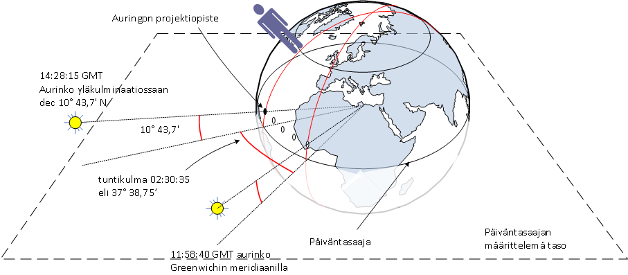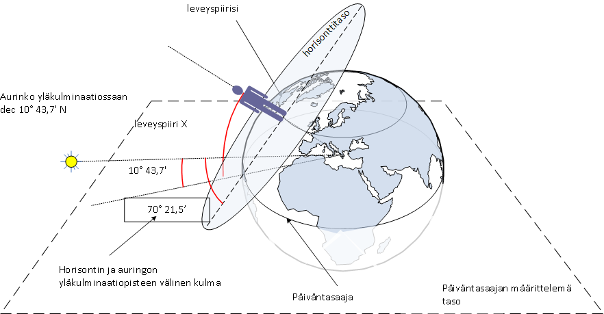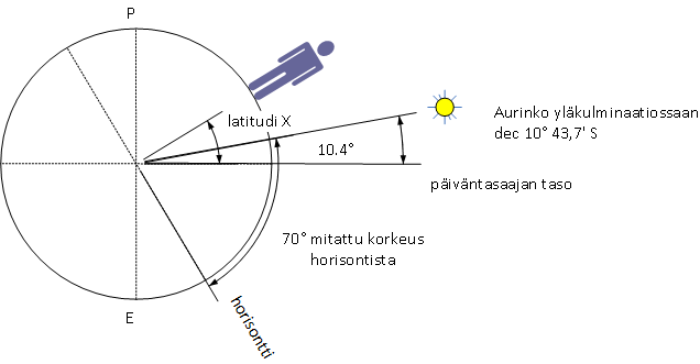 Latitudin ja horisontin välinen kulma on 90°. Horisontin ja päiväntasaajan tason välinen kulma on 70° 21,5’ - 10° 43,7’. Latitudi + horisontin ja päiväntasaan tason välinen kulma = 90°.